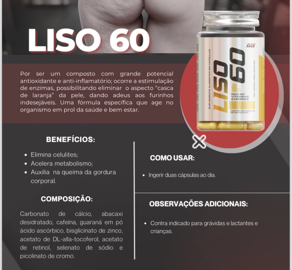 Descubra o poder transformador do Liso 60 da marca Action Max! Este fitoterápico inovador é a solução que você esperava para combater o lipedema e a celulite de forma eficaz.
